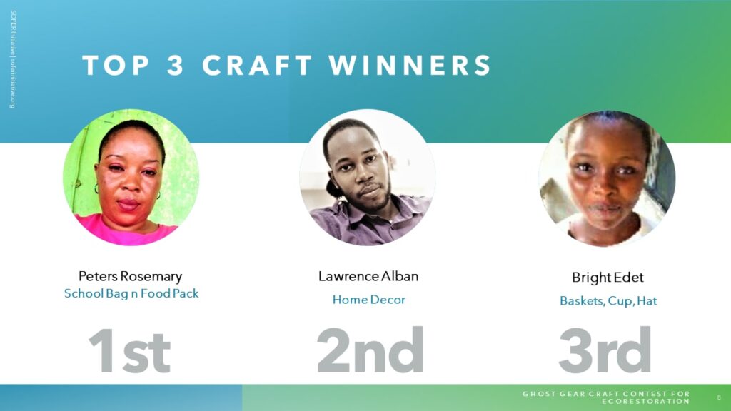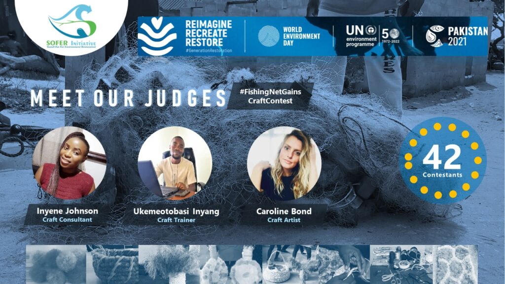 The contest had Inyene Johson and Ukemeotobasi Inyang ; our in-house craft consultant and trainer respectively, as adjudicators, as well Caroline Bond, an international craft artist from the United Kingdom. The basis for judgement was creativity, market value, finesse and durability and the contestants lived up to expectation. In a virtual ceremony to mark the World Environment Day as well as announce the winners, the Director of SOFER Initiative, Emmanuel Sofa noted that it was imperative for us to seek effective ways to offload the pile of ghost gears currently housed in our HubNets at different locations in the country. He further stated that a top fashion brand is already making plans to make fashion items strictly from ghost gear and as such the contest was a foot in the right direction.